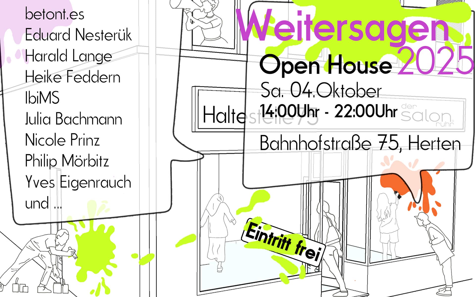 Unsere Veranstaltungsreihe Weitersagen, die immer wechselnde Formate und Orte umfasst, unterschiedliche Kooperationspartner involviert und Alles sein darf, wurde 2025 als Eröffnung der Haltestelle 75 gefeiert. Ein Dutzend Künstler*innen, Freischaffende und Kreative haben die unterschiedlichen Räume an der Bahnhofstraße in Herten bespielt. Viele unterschiedliche Kunstformen kamen zusammen, Alle vereinte die Frage was man vor Ort macht, wie man sich ausdrückt und was das Thema der eigenen Arbeit ist. Bewusst haben wir kein übergreifendes Thema vorgegeben, die Kreativen sollten sich die Räume frei aneignen und Ihre Arbeitsweise eigenständig und frei weiterentwickeln.