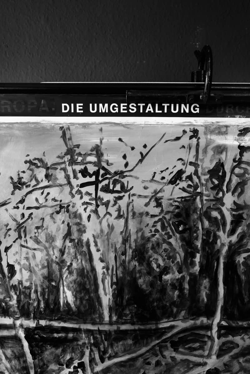 Verschiedene Szenen menschlichen Handelns, Wörter, Ziffern, Tiere und andere Objekte treten in Harald Langes Werken in Erscheinung. Ehem. Schulkarten dienten ihm als Grundlage seiner Arbeit. Durch ihren ursprünglichen Kontext getrennt werden die Bildelemente zeitlos und transformieren sich so zu Symbolen für das Zeitlose. Die benutzen Werke verbinden Vergangenheit, Gegenwart und Zukunft. Die Schulkarten befinden sich auf dem Boden und Teilen der Wände. Sie sollen durch die Besuchenden betreten werden. Ein eigenartiges Gefühl sich auf so detliert, malerischen Motiven zu bewegen. Ich glaube es piept!? Im Raum hat auch ein Vogelhaus seinen Platz gefunden, das die Menschen mit Vogelgezwitscher begrüßt. Die Installation wird stetig weiter entwickelt.