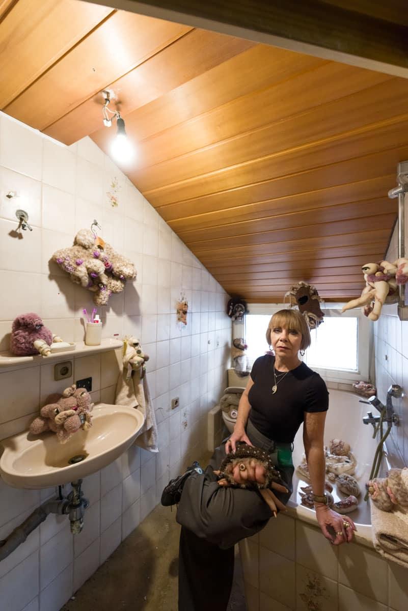 Die Schrullen von Nicole Prinz haben sich in den Badezimmern der Haltestelle 75 breit gemacht. Die kleinen Wesen haben sich selbstständig im gesamten Haus verbreitet. Sie schaffen eine faszinierende Ambivalenz, plüschtierartigweich wirkend, zu gleich durch die Intergration von menschlichen Körperteilen abstoßende Empfindungen weckend.