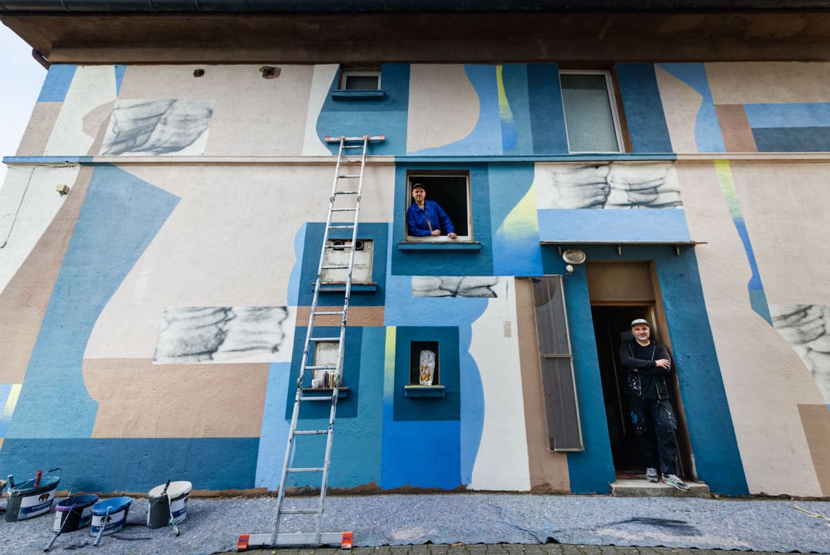 Das Kollektiv betont.es bespielte die seitliche Fassade des Hauses. Die eigenartig angeordneten Fenster und baulichen Elemente der Fassade wurden zur funktionellen Grundlage eines Gestaltungsrasters, auf das sie aufbauten und welches individuelle, rhythmische Kompositionen ermöglichte. Mit Rolle Leiter und Farbe wurde die feinstaubbraune Wand farbig, formenreich und überraschend.